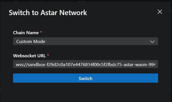 Refer to [step 3, "Connect to Astar WASM"](#3. Connect to Astar WASM), select "Custom Mode," and enter the WebSocket URL you copied in the previous step. Then, click "Switch."