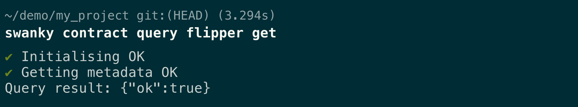 Successfully running the deploy command will print out the address your contract is deployed to, as well as save it into swanky.config.json