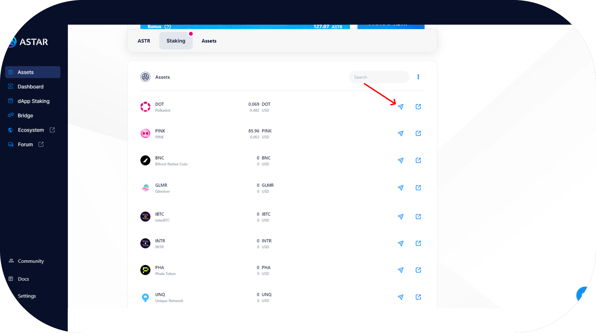 - Choose the substrate token you want to transfer to Astar Network and press the transfer button symbolized by a paper plane icon;