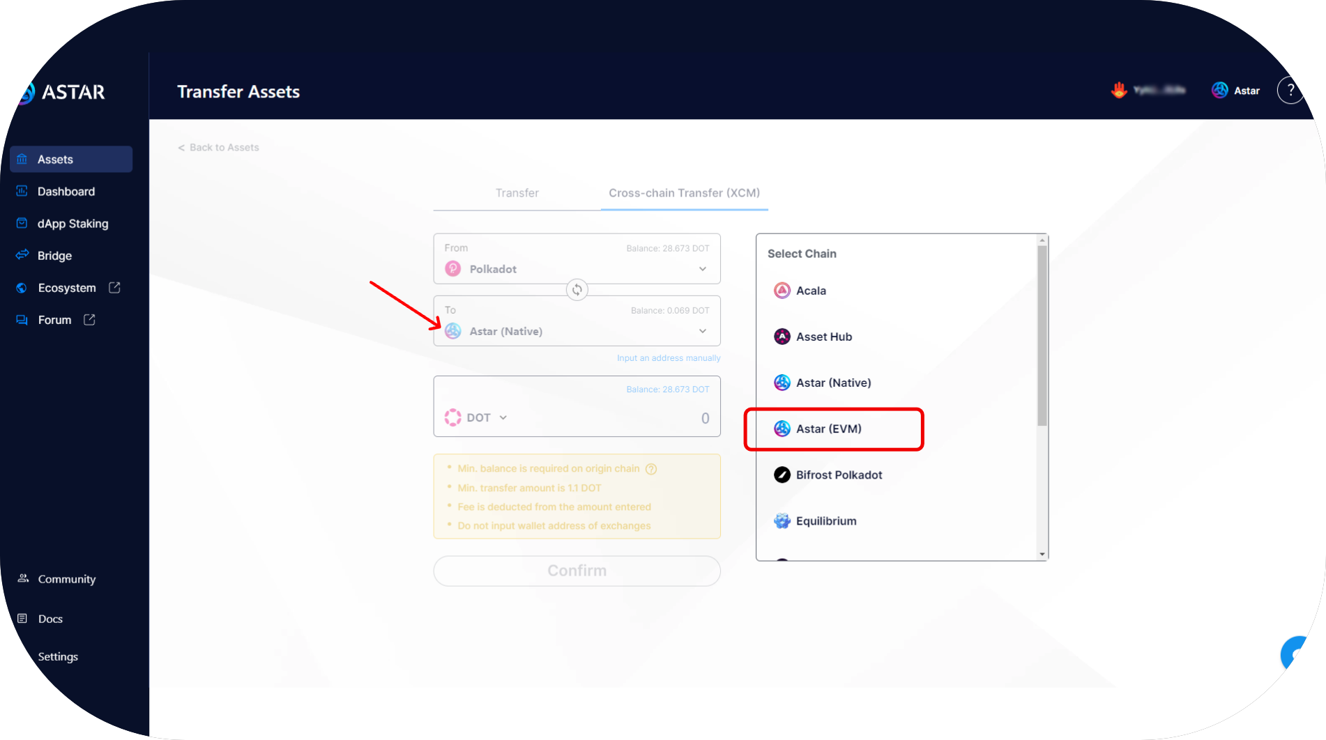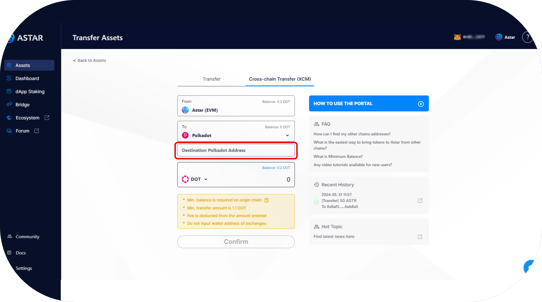 - You are now on the transfer page. Enter your Astar EVM address and the amount you want to transfer, then press