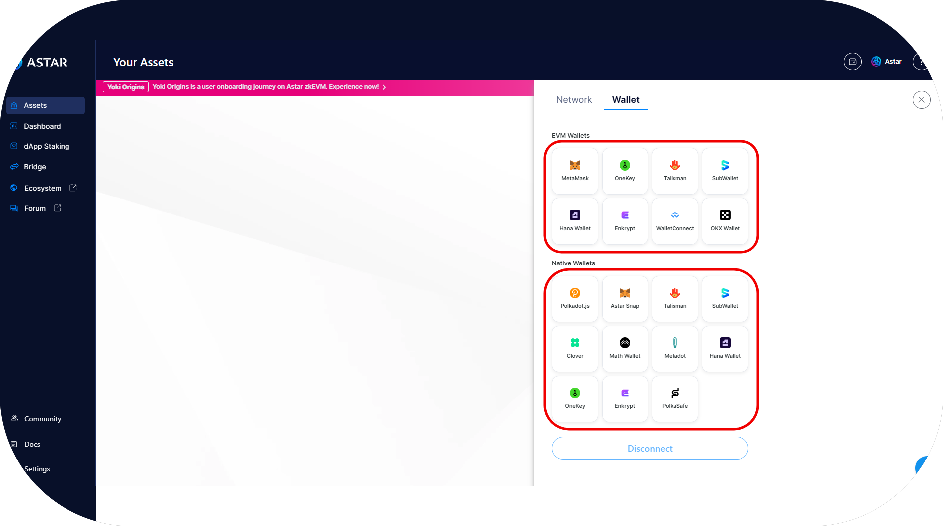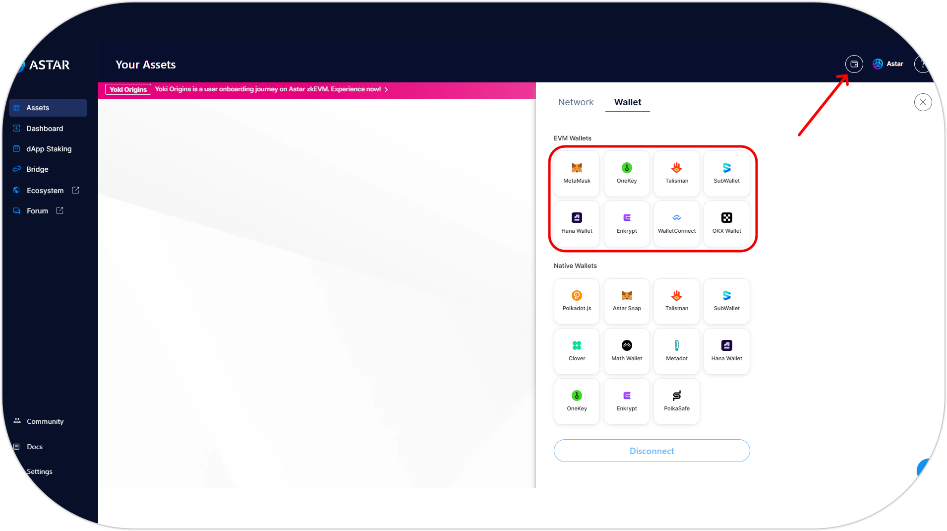 - Visit the Astar Portal, choose an EVM wallet provider (Metamask, Talisman, Subwallet, WalletConnect, etc.) and select the Astar EVM account you want to connect;
