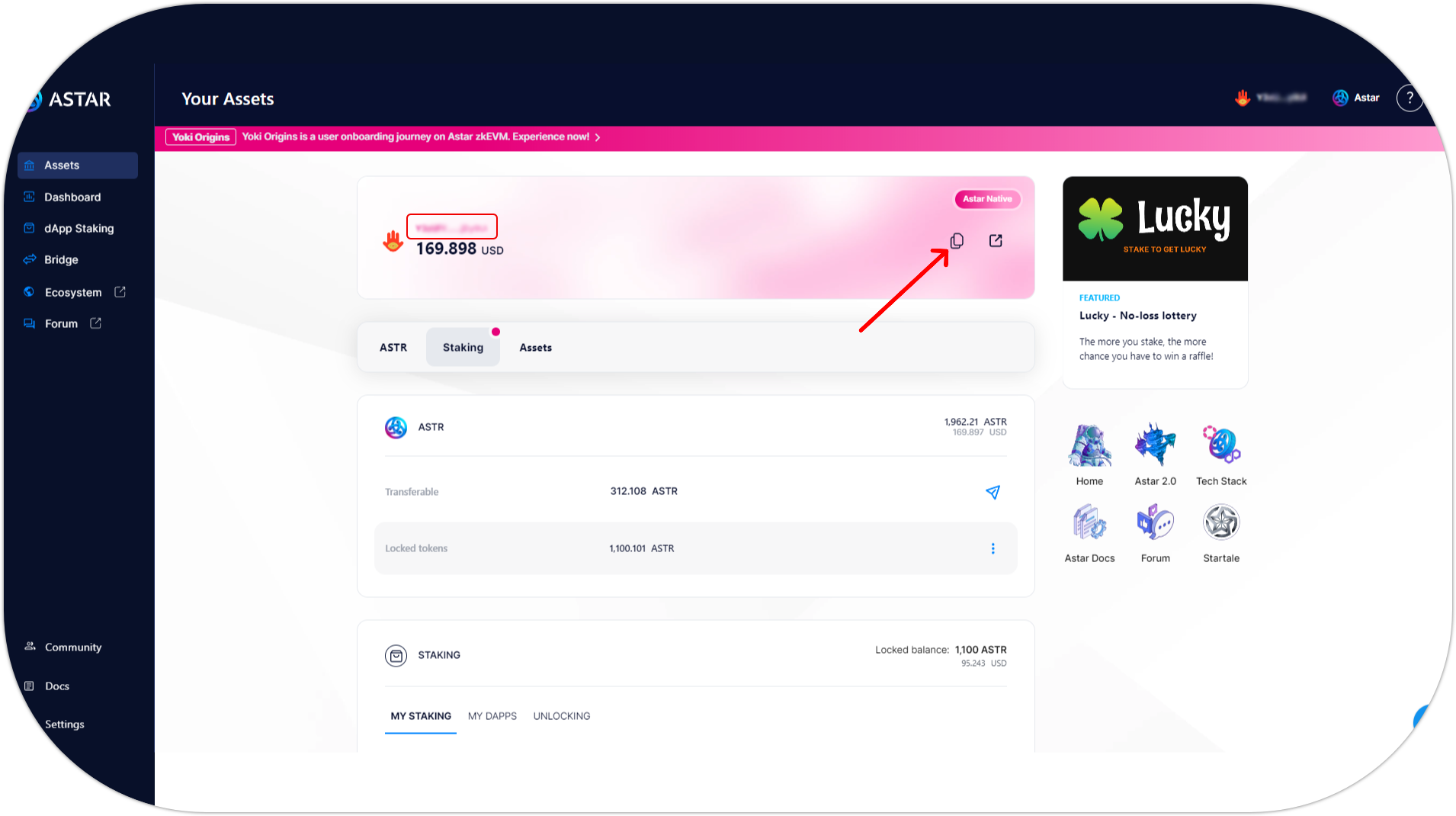 - Visit the Astar Portal and connect your Astar Substrate account to copy the address to which you want to receive your tokens;